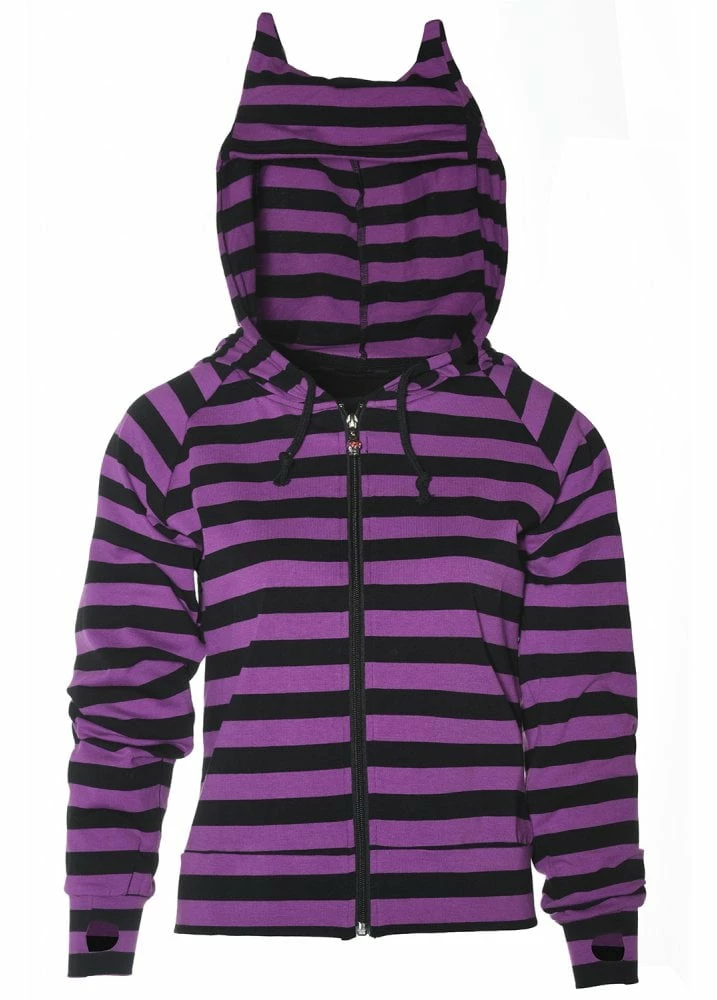 The Cat Ears Purple & Black Striped Zip Hoodie from Banned Apparel is a cute fitted hooded top. The striped hoodie has a zip front with skull zip charm, thumbholes and a hood with kitty ears.