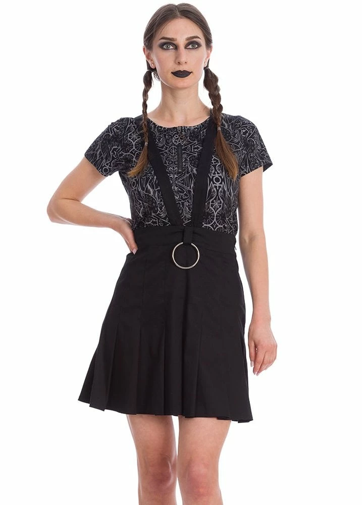 The Dark Dreams Pleated Skirt from Banned Apparel is a mini skirt with attached suspender straps. The alternative skirt is pleated and features a silver O-ring at the centre waistband.