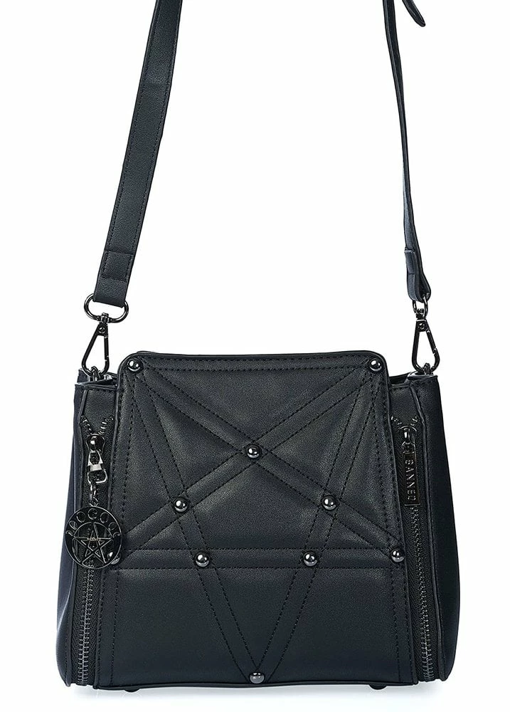 This PU handbag from Banned is the perfect mini handbag for your essentials. The Darq Crossbody Bag has an embossed pentagram on the front with studs, zips and an adjustable strap.