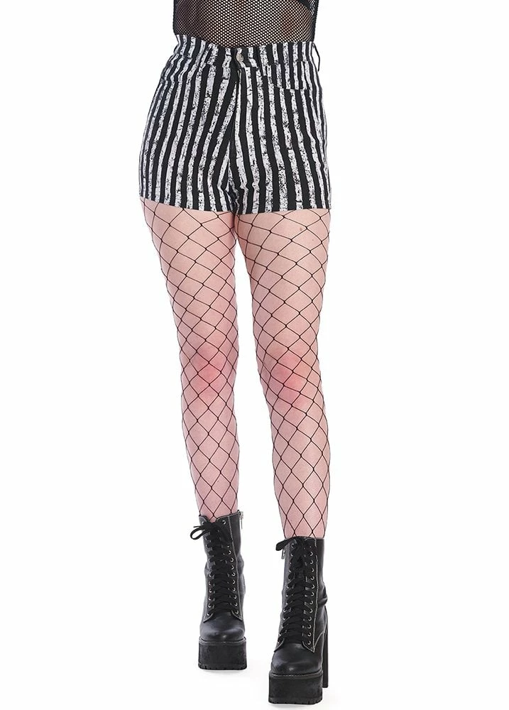 The Distressed Waves Shorts are a pair of high waisted short with button and zip fastening. The shirt are black and white distressed stripes and look great with fishnets.