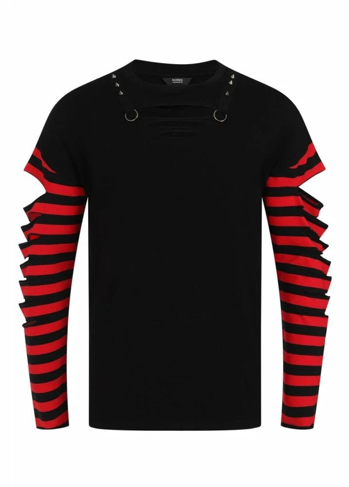 The Hellebore Top from Banned Apparel is a black T-shirt with red and black striped long sleeves. The punk style top has a slashed neckline, slashed sleeves and spike stud and O-ring detail.