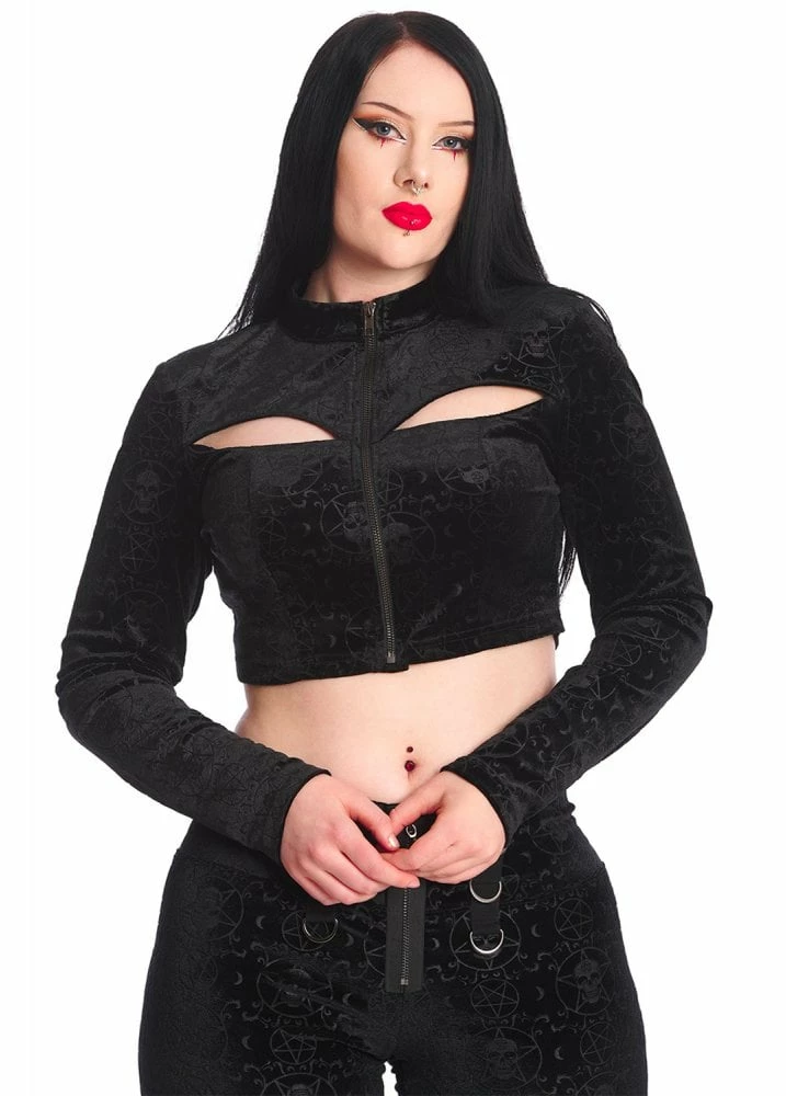 Banned Apparel’s Dream Crusher Top is a gothic velvet long sleeved crop top. The top has cut out detail, a zip front and all over pentagram and skulls design.