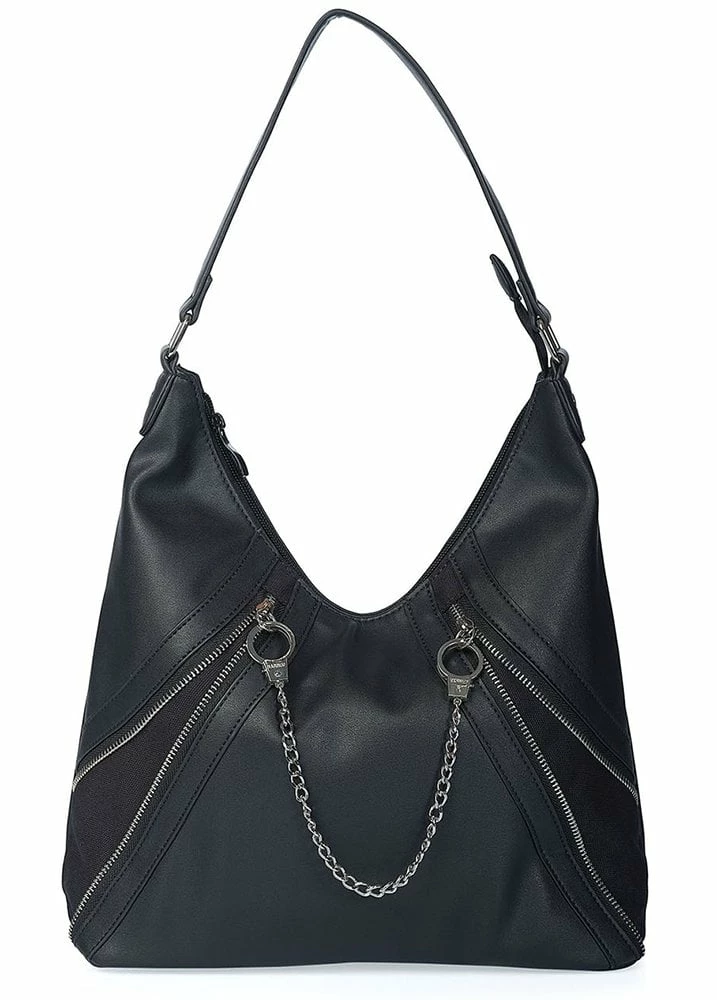 The Entwined Hobo Bag from Banned Apparel is a good sized handbag with top handle. The gothic bag has a zipped main compartment with zips and handcuffs and chains detail on the front.