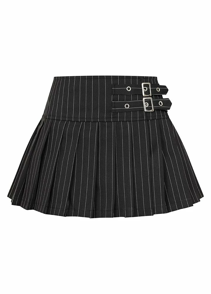 This wrap-around style mini skirt from Banned Alternative features white pinstripe detail, fully pleated skirt and has a two buckle side fastening at the waist.