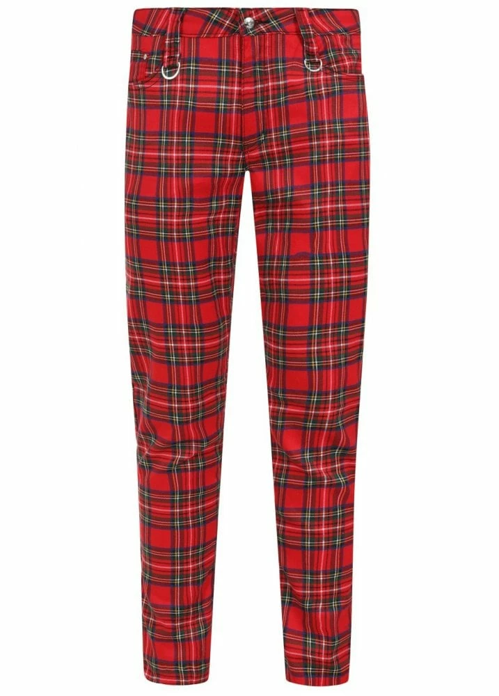 The Lydon Pants from Banned Apparel are a pair of red tartan slim fit trousers. These bright, red check punk style pants have a zip fly and patch zip details.