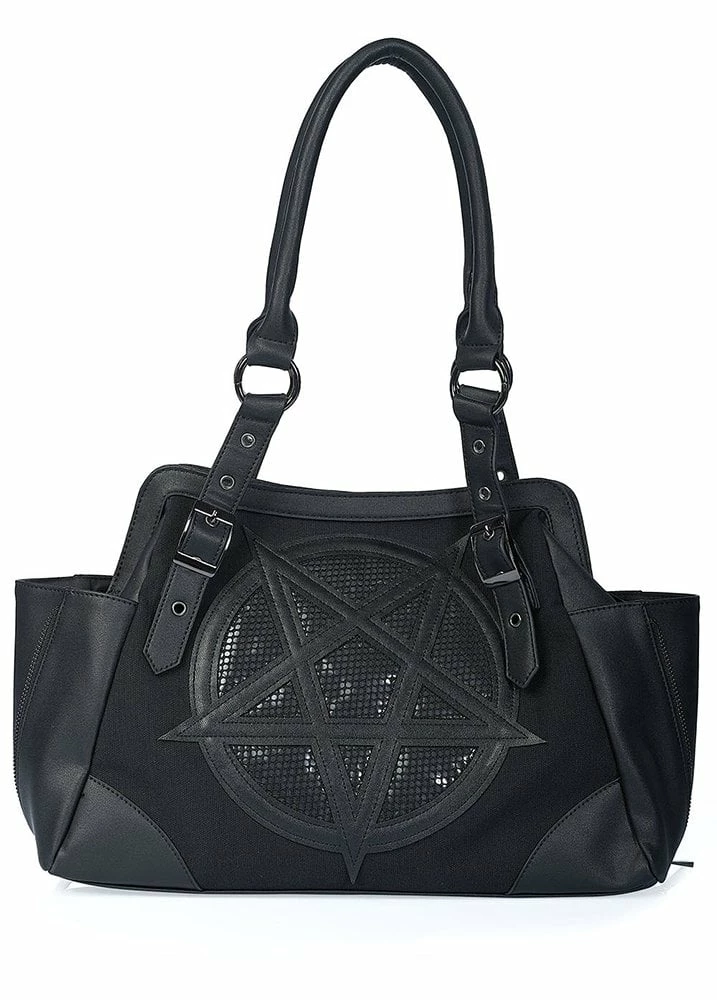 Trimmed with vegan leather, this canvas gothic handbag from Banned Apparel has zip fastening main & side compartments, adjustable buckle straps and large mesh backed pentagram detail.
