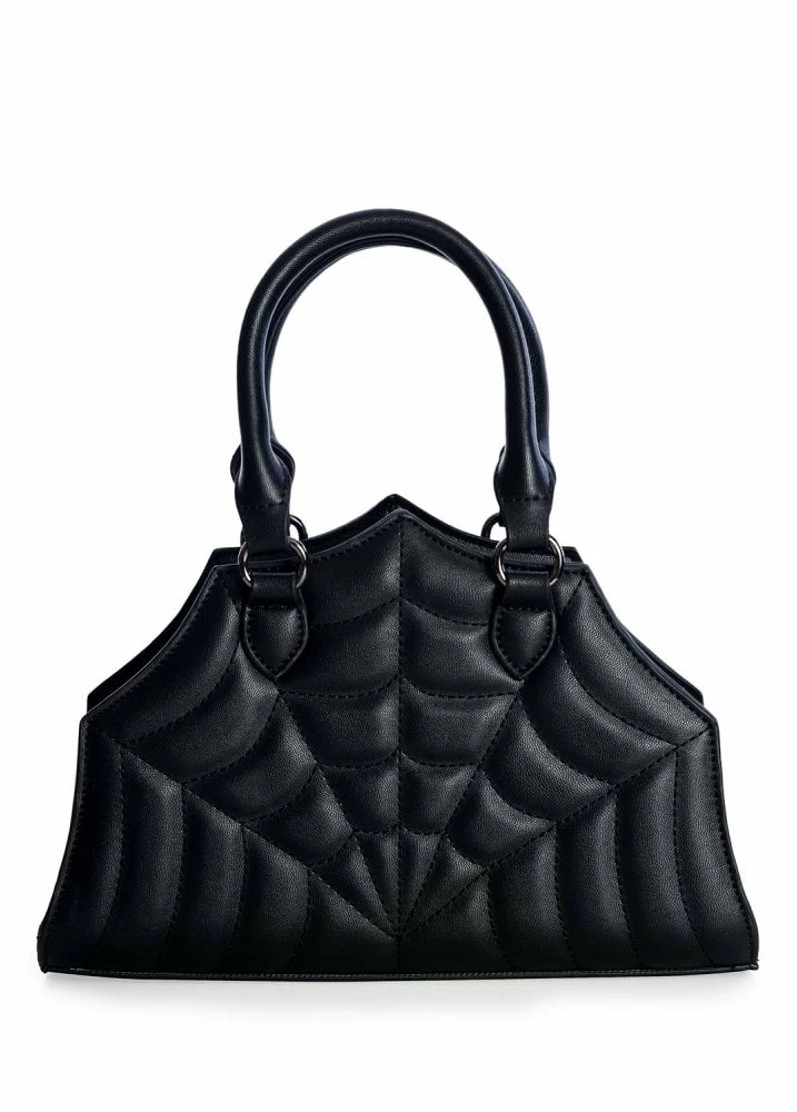The Siri Handbag is a spooky spiderweb bag. The black gothic handbag has a quilted spiderweb front, a top handle, zip fastening, outer zip pocket and detachable shoulder strap.