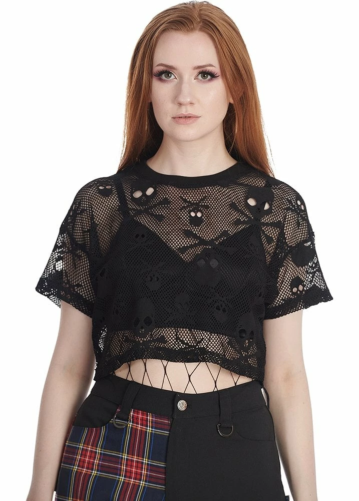 The Skull Queen Cropped Top from Banned Apparel is a versatile cropped T-shirt in skull mesh.