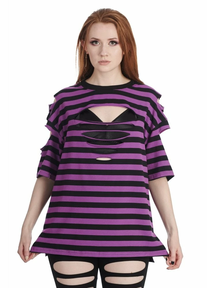The Sweet Tooth Oversized T-Shirt from banned Apparel is a comfy oversized top. The purple and black striped top has a ripped front and sleeves.
