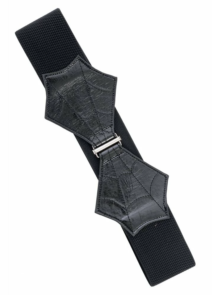 Finish off your look with Banned Apparel’s Tabitha Elasticated Belt. This elasticated waist belt has a fabulously spooky spiderweb batwing buckle front.