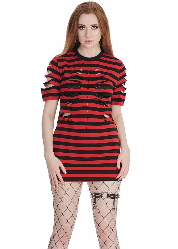 Banned Apparel’s Toxic Tears Dress is a cool little T-shirt dress. The red and black striped dress has a black ringer neckline and ripped design.