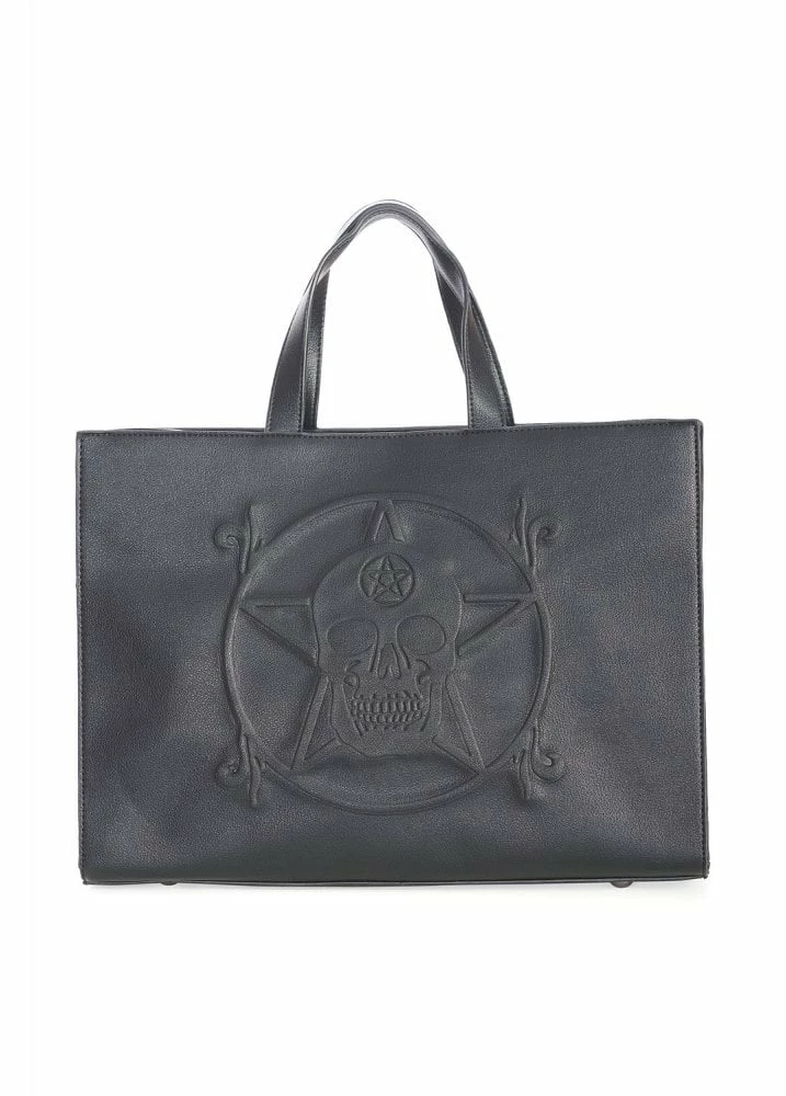 The White Magic Skull Tote Bag form Banned Apparel is a black PU bag with top handle. The gothic bag has a detachable shoulder strap and a skull and symbol embossed front.