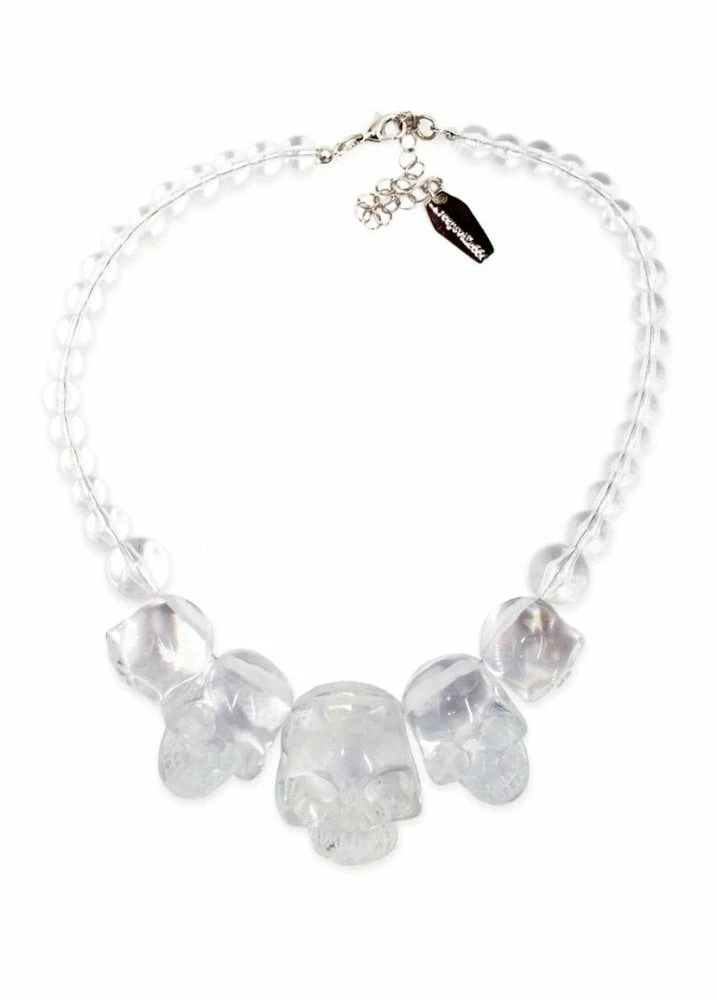 The Skull Collection Necklace by Kreepsville 666 is a clear beaded necklace with a centrepiece of skulls in different sizes. This necklace looks awesome as a statement piece or part of your psychobilly outfit!