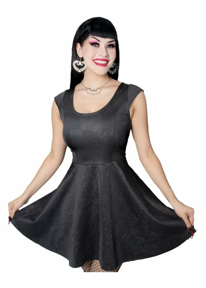 The Death Repeat Embossed Marilyn Dress by Kreepsville is a spooky skater dress! This super cute and comfortable dress has a scoop neckline and a subtle yet eye-catching Death Repeat embossed design featuring bats, skeletons, coffins and eyeballs!