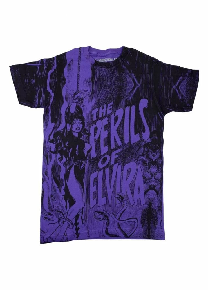 The Elvira Perils Of Purple Men’s T-shirt from Kreepsville 666 is a striking black and purple cotton tee. The top features an all over print Elvira Mistress of the Dark.