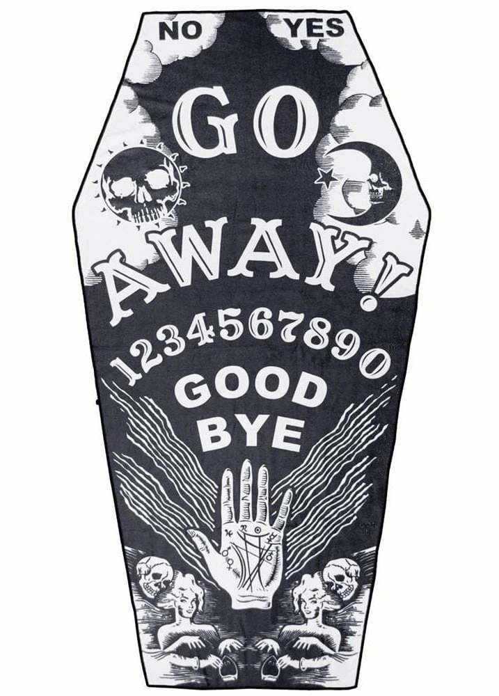 You won’t lose your spot at the beach with the Go Away Ouija Coffin Shaped Towel from Kreepsville. The black coffin shaped towel is perfectly sized and features a white ouija design.