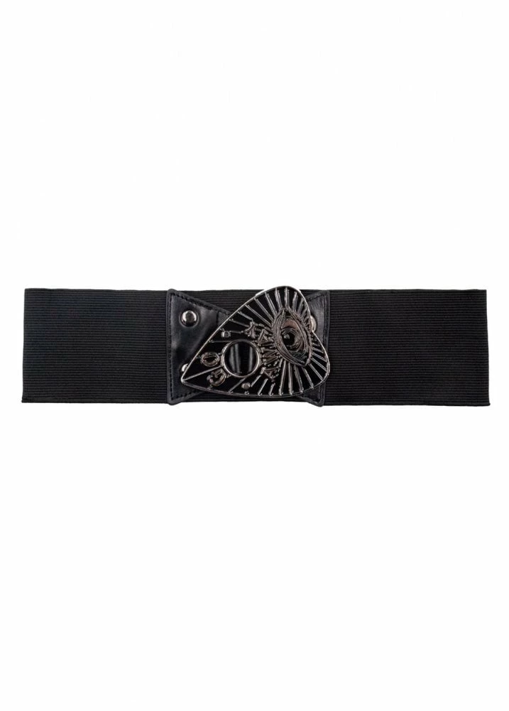 Summon some style with Kreepsville’s Go Away Planchette Elastic Waist Belt! Its retro style, soft elastic and high stretch waist belt cinches your waist in the most alluring and comfortable way. Featuring a spooky planchette with ‘Go Away’ slogan in chrome metal alloy finish and double belt hook fastening. This belt is the perfect accessory for adding a spooky look to your outfit.