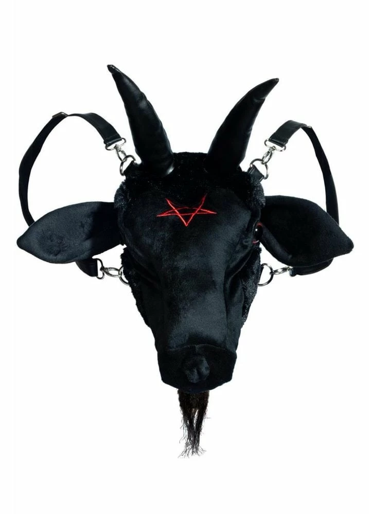 The Goathead Baphomet Plush Bag from Kreepsville is a cuddly, yet demonic bag. The gothic bag has a multi way strap system that means this bag can be worn as a backpack, shoulder purse or cross body bag. The bag is a super soft plush with embroidered pentagram, demonic red bead eyes, vinyl horns and back, tufted beard and deep interior that fits most combos of phone and wallet. The occult bag has a zip closure with coffin zip pull.