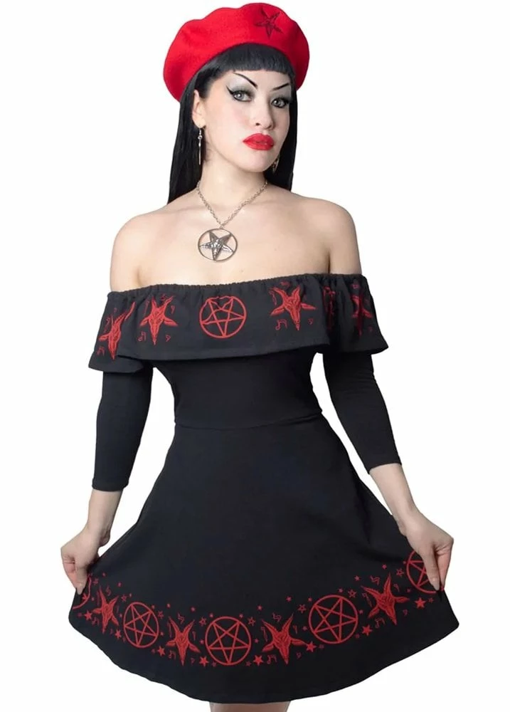 The Satanic Circle Ruffle Dress by Kreepsville 666 is the perfect way to add some devilish style to your wardrobe! This fun & flirty little black dress features a repeat pattern of red Baphomets and inverted pentagrams front & back, with a non-slip off shoulder ruffle top and ¾ length sleeves. Made in the USA.