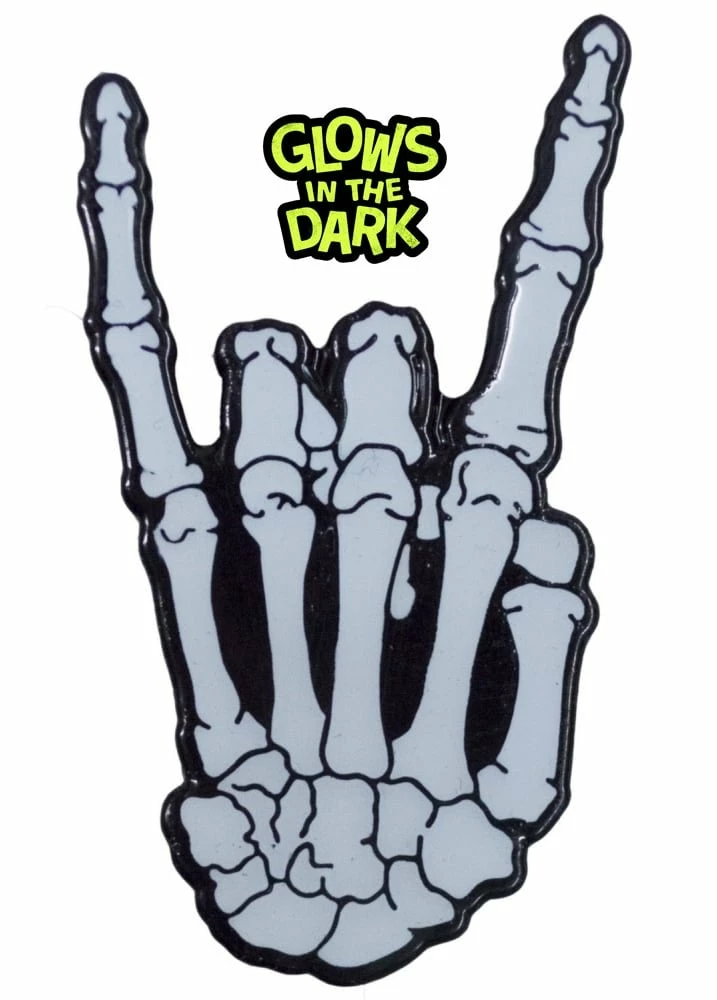 The Skeleton Devil Glow Enamel Pin Badge is a grey and black pin with rubber clutch fastening and eerie glow in the dark effect. The alternative pin has a skeleton devil horns design and looks fab pinned to jackets and bags.