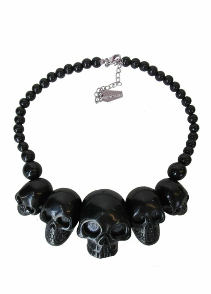 The Skull Collection Necklace by Kreepsville 666 is a black beaded necklace with a centrepiece of skulls in different sizes. This necklace looks awesome as a statement piece or part of your psychobilly outfit!