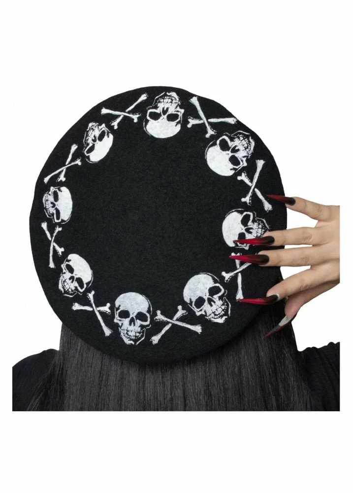 Kreepsville’s Skulls & Bones beatnik beret hat featurers an anatomical classic skull & crossbones repeat print on the back and small crossbones embroidery on the front. Made out of 90% wool and 10% polyester blend, it’s comfortably snug and one size fits most.