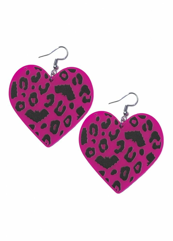 The Batty Leopard Earrings from Sourpuss are a cute pair of heart shaped drop earrings. The psychobilly earrings have a leopard and bats print design with nickel-free hooks.