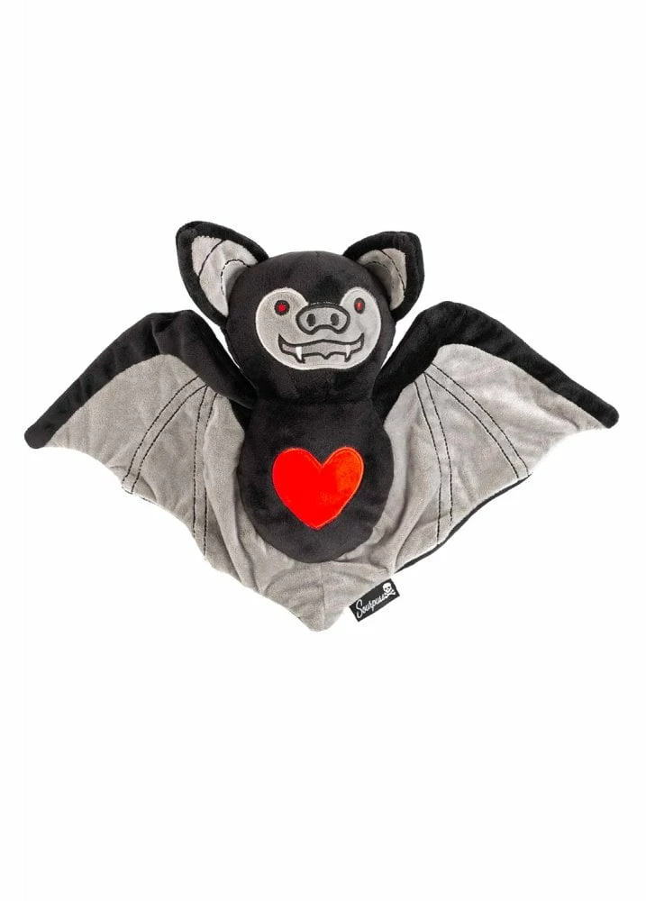 Snuggle up to the cuddliest bat with the spooky Bat Plush from Sourpuss! He is made of a super soft material with embroidered details and a big heart on his belly. Looks great on your bed or couch too!