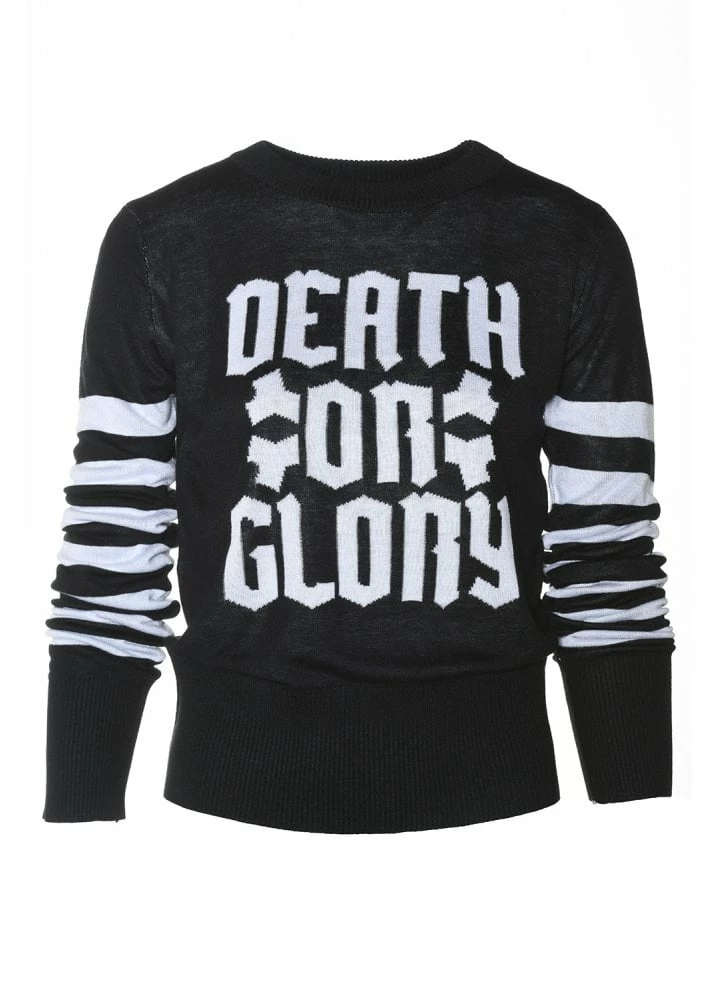 The Death or Glory Sweater from Sourpuss is a comfy viscose sweater with black and white striped sleeves. The alternative jumper features a ‘Death or Glory’ slogan knitted into the sweater.